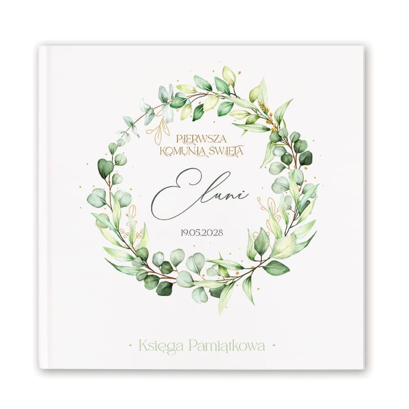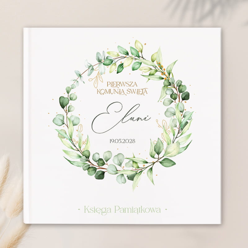 Personalizowana Księga Pamiątkowa na Komunię Świętą z motywem zielonego wianka to elegancka pamiątka na wpisy, życzenia i zdjęcia.