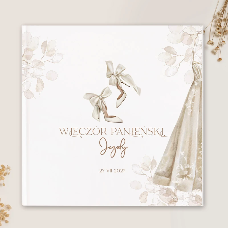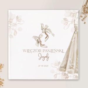 Przepiękna księga na pamiątkowe wpisy. Oprawiona sztywną okładką z nietuzinkową grafiką na przedzie. Buty ślubne na wysokim obcasie z dużymi kokardami dodają ślubnej aury do tego, co znajdzie się wewnątrz księgi. Na okładce nie zabraknie również personalizacji w postaci imienia przyszłej panny młodej i daty jej wieczoru panieńskiego