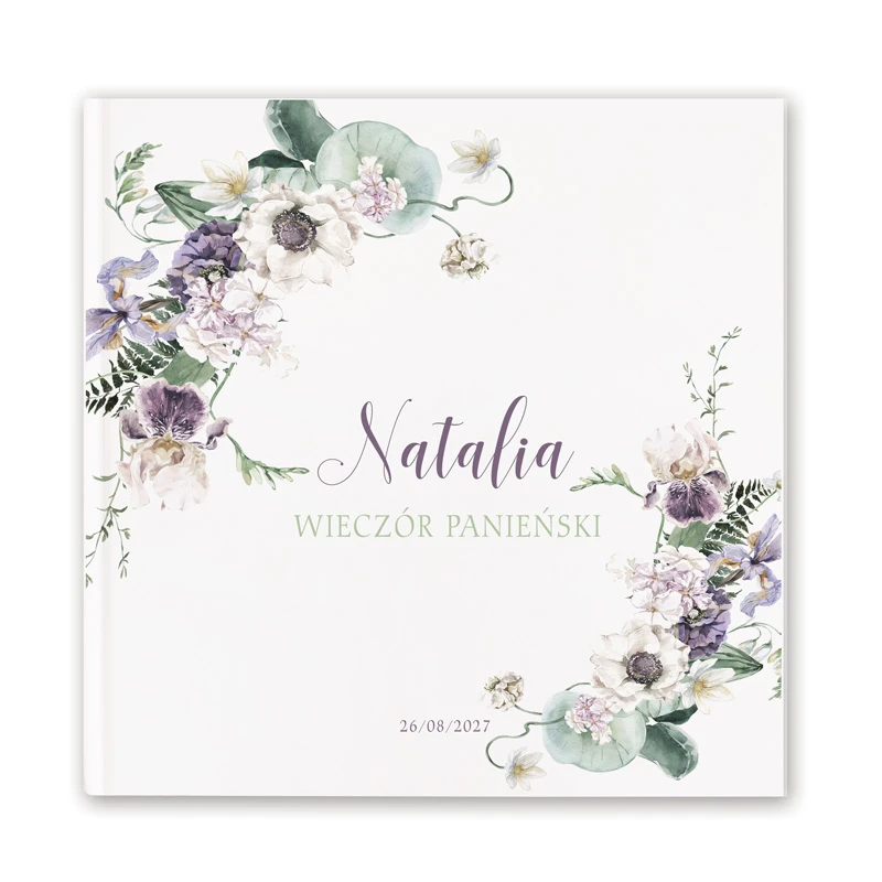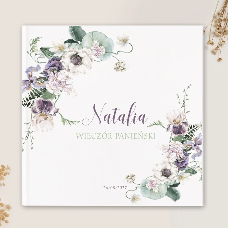 Pamiątkowa księga na panieński to zbiór czystych kart w kolorze białym oprawionych w twardą oprawę. Oprawa ozdobiona jest subtelnym motywem roślinnym, a na środku widnieje personalizowany napis: IMIĘ Wieczór Panieński, DATA. Motyw roślinny z zawilcami, irysami i liśćmi paproci utrzymany jest w stylu vintage, który tworzy romantyczny i niezwykle kobiecy klimat. W pamiątkowej księdze na panieński wszystkie uczestniczki spotkania będą mogły przekazać przyszłej pannie młodej kilka słów od serca lub rady dotyczące życia małżeńskiego. To przydatny gadżet, który będzie doskonałym prezentem dla przyszłej panny młodej i pamiątką tego niezwykłego spotkania. Pamiątkowa księga z motywem roślinnym należy do serii dodatków na panieński Kwiaty, dzięki którym stworzysz niezwykłą aranżację na panieński w stylu boho, romantycznym lub glamour.
