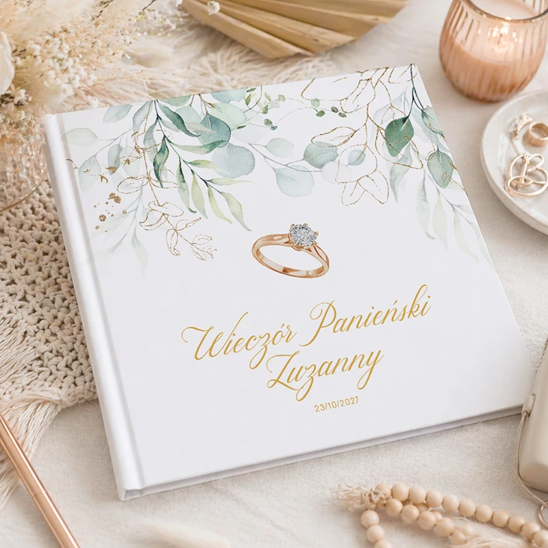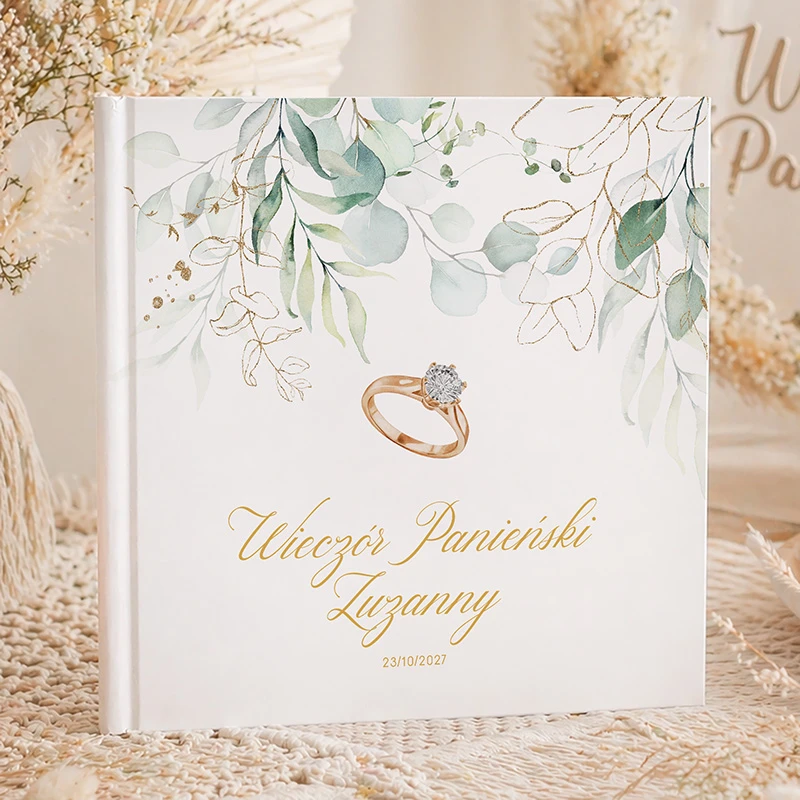 Księga pamiątkowa z eleganckim motywem Pierścionka Zaręczynowego to wyjątkowy sposób na zatrzymanie najpiękniejszych chwil z wieczoru panieńskiego.
