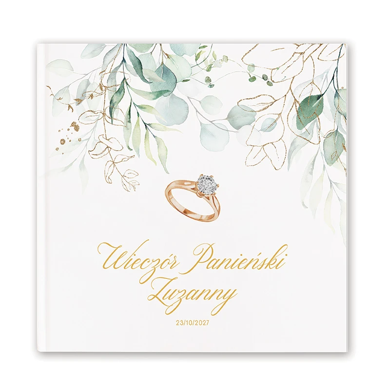 Księga w formie kwadratowego albumu w białej, sztywnej oprawie, jego okładkę zdobi personalizacja z imieniem Panny Młodej i datą oraz napisem "Wieczór Panieński". Na okładce znajduje się nadruk z kolekcji Pierścionek Zaręczynowy - okładki nie zdobi zwykła kartka z personalizacją, ale nadruk nanoszony jest bezpośrednio na nią. Nadruk wykonywany jest nowoczesną i trwałą metodą! Wszystkie karty księgi są puste.