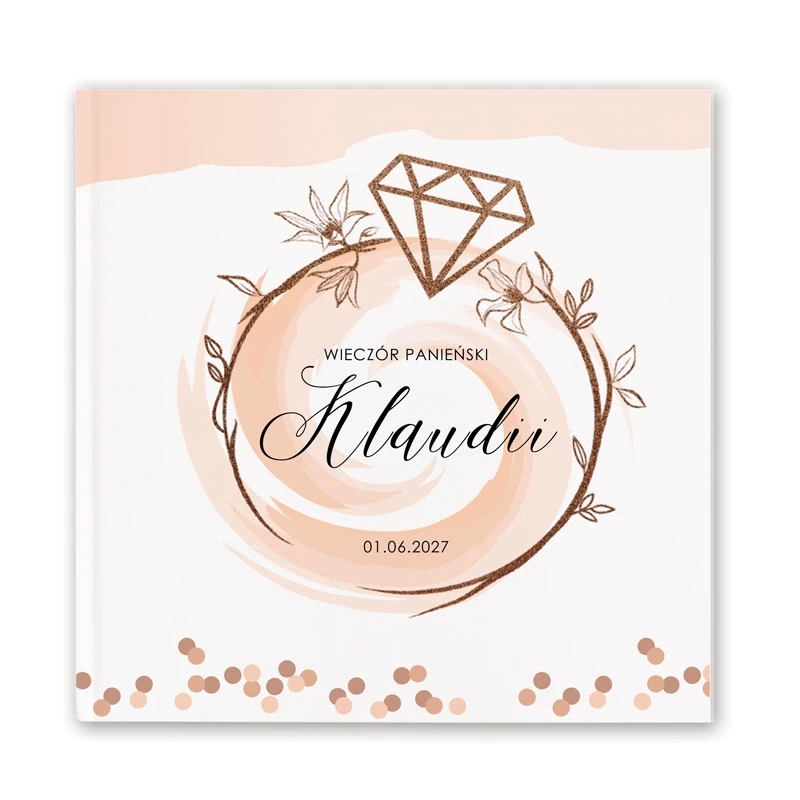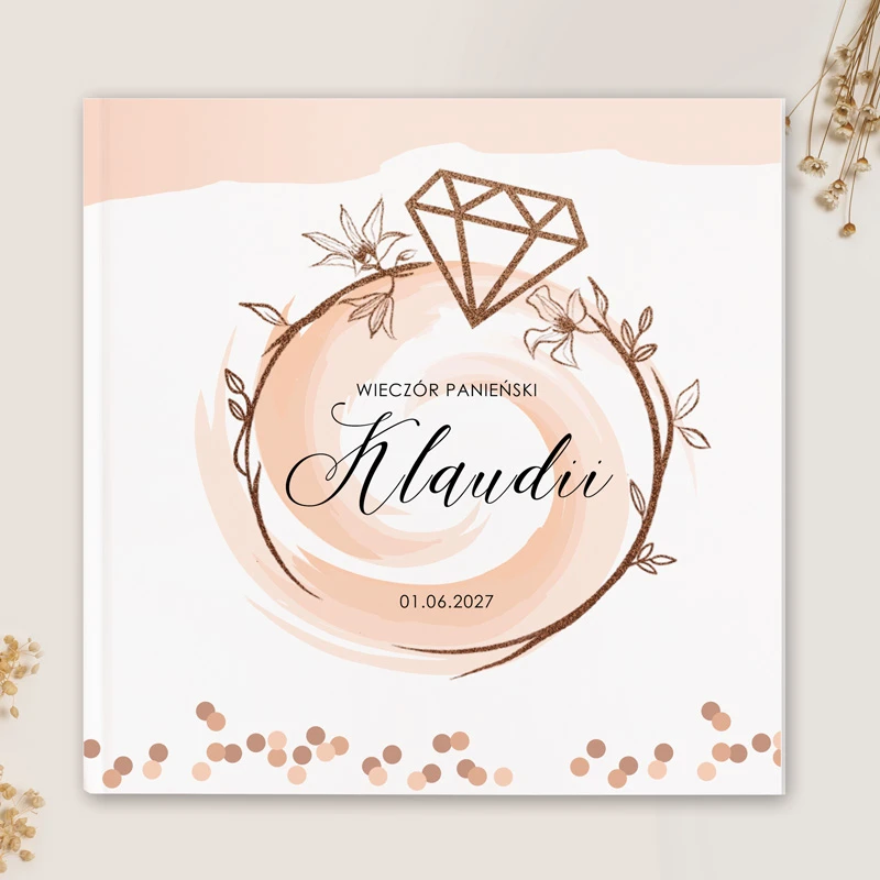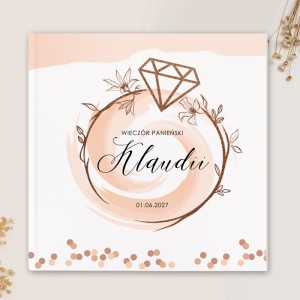- księga w formie kwadratowego albumu w białej, sztywnej oprawie, jego okładkę zdobi personalizacja z imieniem Panny Młodej i datą oraz napisem "Wieczór Panieński"