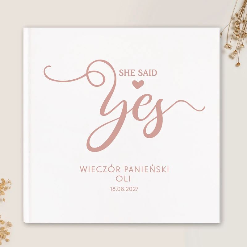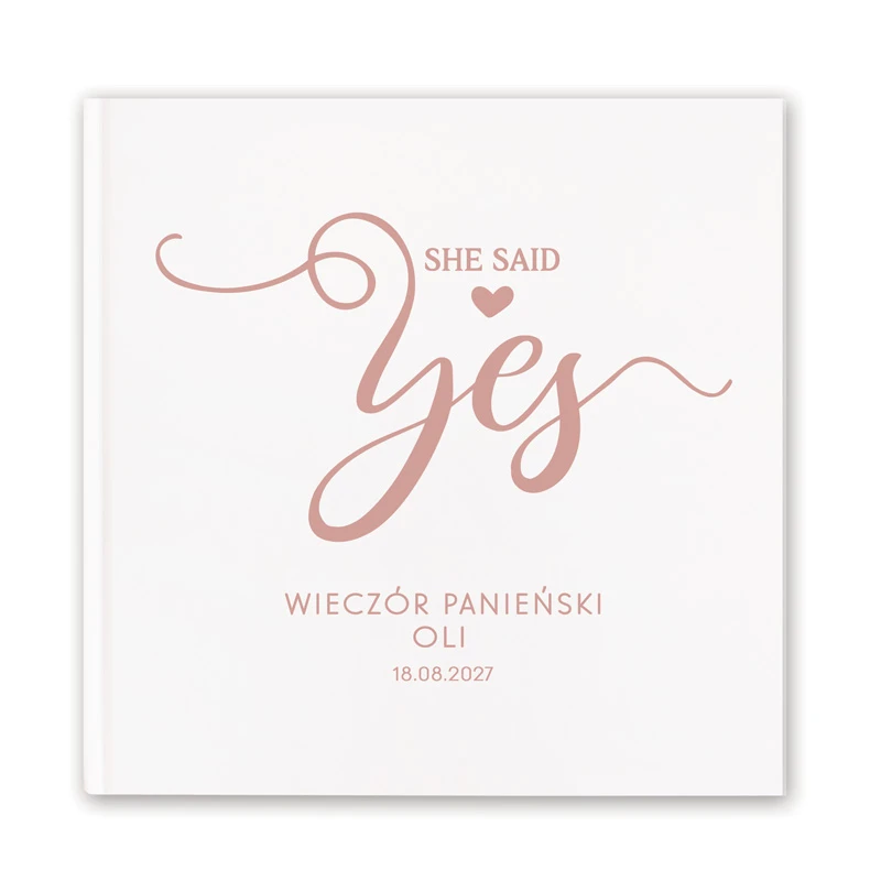 Księga wieczoru panieńskiego składa się pięćdziesięciu sztywnych kart umieszczonych w twardej oprawie. Jasna okładka ozdobiona jest napisem: She said yes, wieczór panieński IMIĘ PRZYSZŁEJ PANNY MŁODEJ, DATA. Minimalistyczny styl okładki oraz modny kolor pudrowego różu sprawiają, ze album prezentuje się bardzo elegancko i kobieco. Na pustych stronach każda z uczestniczek spotkania będzie mogła umieścić kilka życzliwych słów — zabawną anegdotkę, słowa wsparcia, gratulacji czy życzeń. Do księgi można wklejać także zdjęcia oraz inne pamiątki z wieczoru panieńskiego. Strony można dowolnie dekorować — wówczas powstanie scrapbookingowa księga wspomnień z wieczoru panieńskiego będąca wspaniałą pamiątką tego wydarzenia. Księga należy do serii dekoracji i dodatków na panieński She said Yes!. Znajdziesz w niej wiele ciekawych propozycji, które pomogą Ci stworzyć zjawiskową aranżację wieczoru panieńskiego.