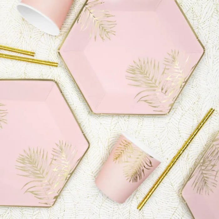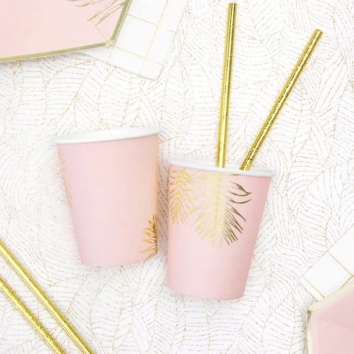Kubeczki przygotowane w naszym sklepie internetowym to wysokiej jakości produkt. Postawiliśmy na wytrzymałość, dlatego podczas produkcji zastosowano wzmocnioną tekturę. Dzięki temu nie przemoknie po wlaniu napoju. Co więcej, możesz nalać do środka zarówno zimne, jak i ciepłe napoje, co jest ich dodatkowym atutem. Zdajemy sobie sprawę, że na tego typu okazję najczęściej wybieranym kolorem jest róż. To właśnie dlatego w tym przypadku wybraliśmy delikatny pudrowy kolor, który zdobią delikatne złote liście palmowe. Czasem niewielkie akcesoria i gadżety sprawiają, że wszystkie dekoracje zaczynają tworzyć spójną całość. Szukając odpowiedniego, produktu postawiliśmy na niewielkie kubeczki do napojów. Te doskonale wzbogacą pięknie zastawiony stół, a do tego będą niezwykle użyteczne. Kubeczki są produktami jednorazowymi. Zaoszczędzicie dzięki temu czas, który trzeba by było poświęcić na sprzątanie. Wybierz wyjątkowe gadżety, które uświetnią wspólnie spędzony czas. Kubeczki to nie tylko praktyczny dodatek, który ułatwi sprzątanie po imprezie - będą też uroczą, dziewczęcą dekoracją stołu.