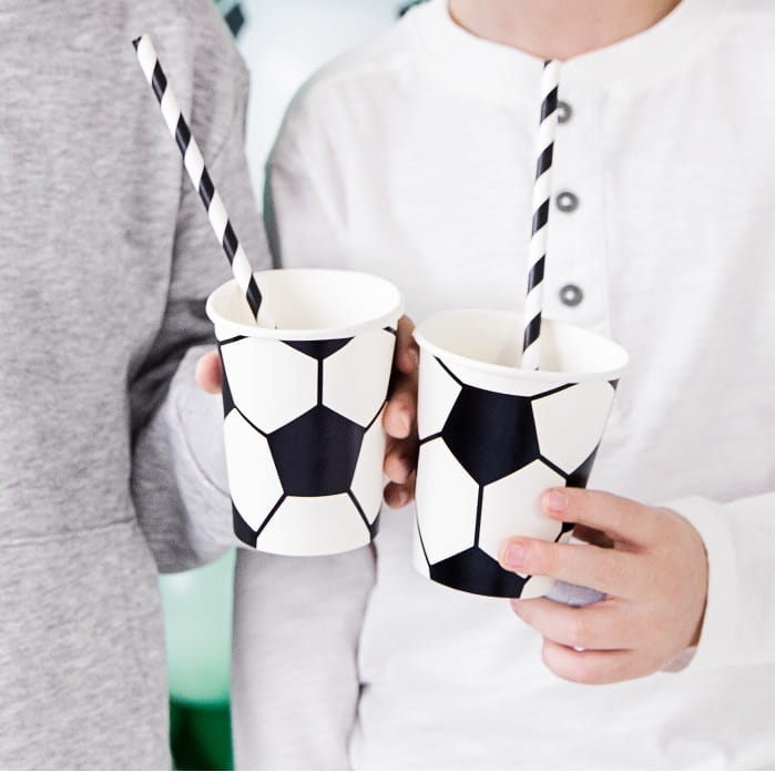 Papierowe kubeczki z motywem piłki nożnej to doskonały wybór na urodziny małego fana sportu. Sprawdzą się na tematyczne przyjęcie, tworząc spójną i efektowną oprawę imprezy. Prosty, kontrastowy wzór idealnie uzupełnia inne dekoracje i ozdoby stołu. Komplet 6 sztuk świetnie nadaje się do serwowania napojów podczas dziecięcych wydarzeń z motywem piłki.