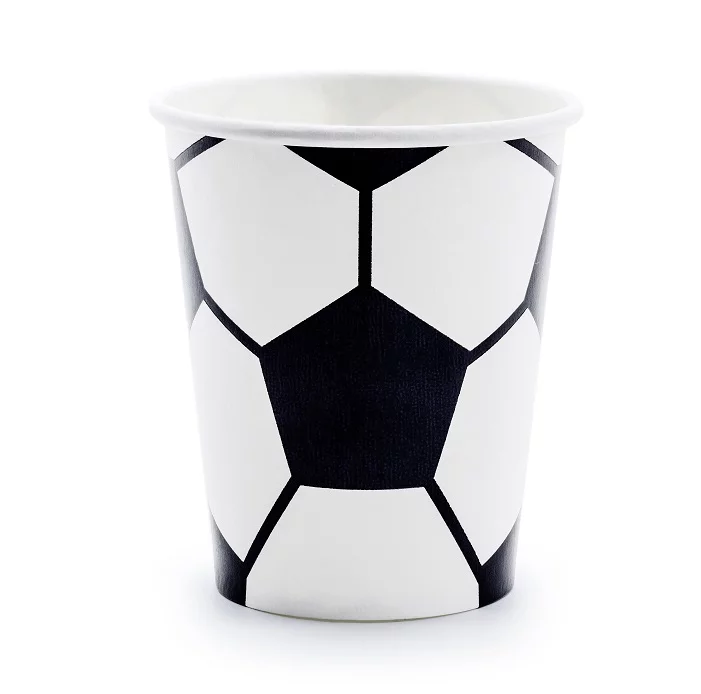 Każdy kubeczek wykonany jest z papieru o odpowiedniej grubości, co zapewnia komfortowe użytkowanie podczas picia napojów. Motyw graficzny odwzorowuje klasyczną czarno-białą piłkę nożną. Komplet zawiera 6 sztuk kubeczków.