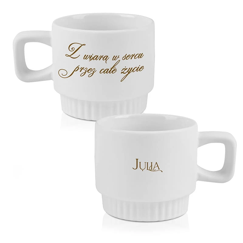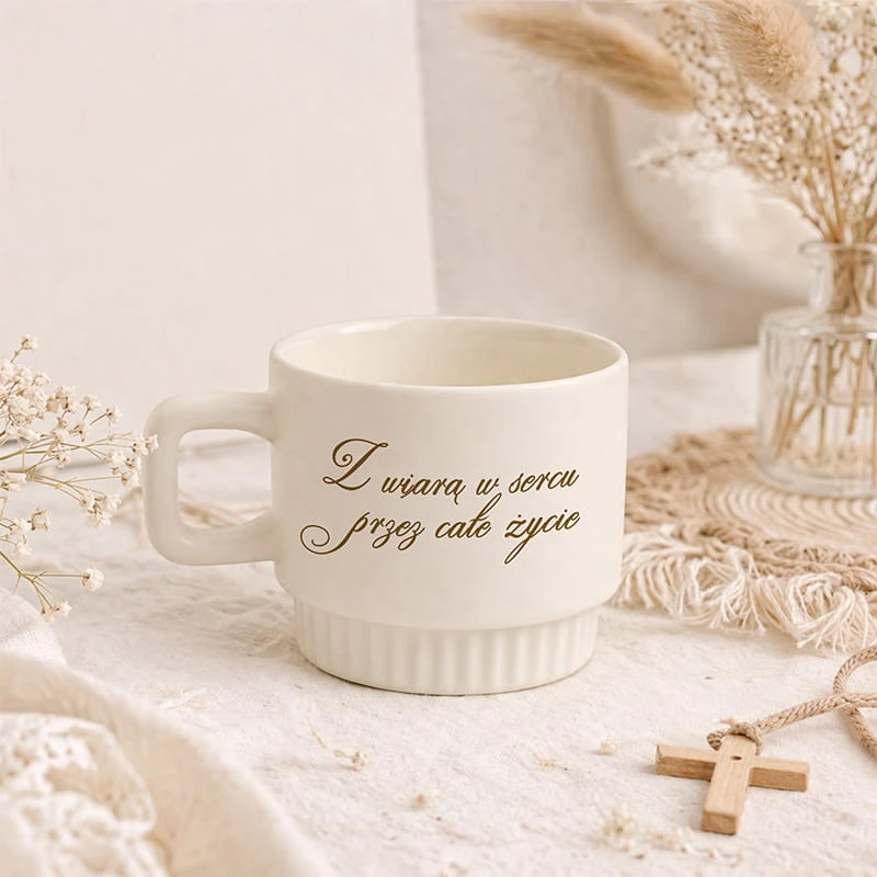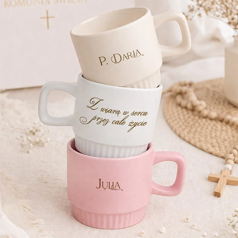 Kubek dostępny jest w trzech klasycznych kolorach: kremowym, białym oraz różowym, dzięki czemu łatwo dopasować go do osoby obdarowanej - zarówno dziecka, jak i dorosłego. Ozdobna, ryflowana powierzchnia nadaje mu nowoczesnego i stylowego charakteru. Na kubku znajduje się subtelny napis „Z wiarą w sercu przez całe życie”, który podkreśla jego duchowy wymiar, a personalizacja imieniem sprawia, że prezent staje się wyjątkowy i osobisty.