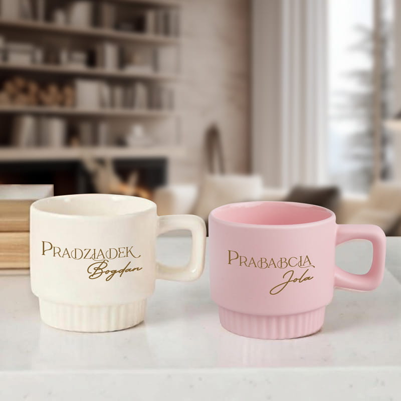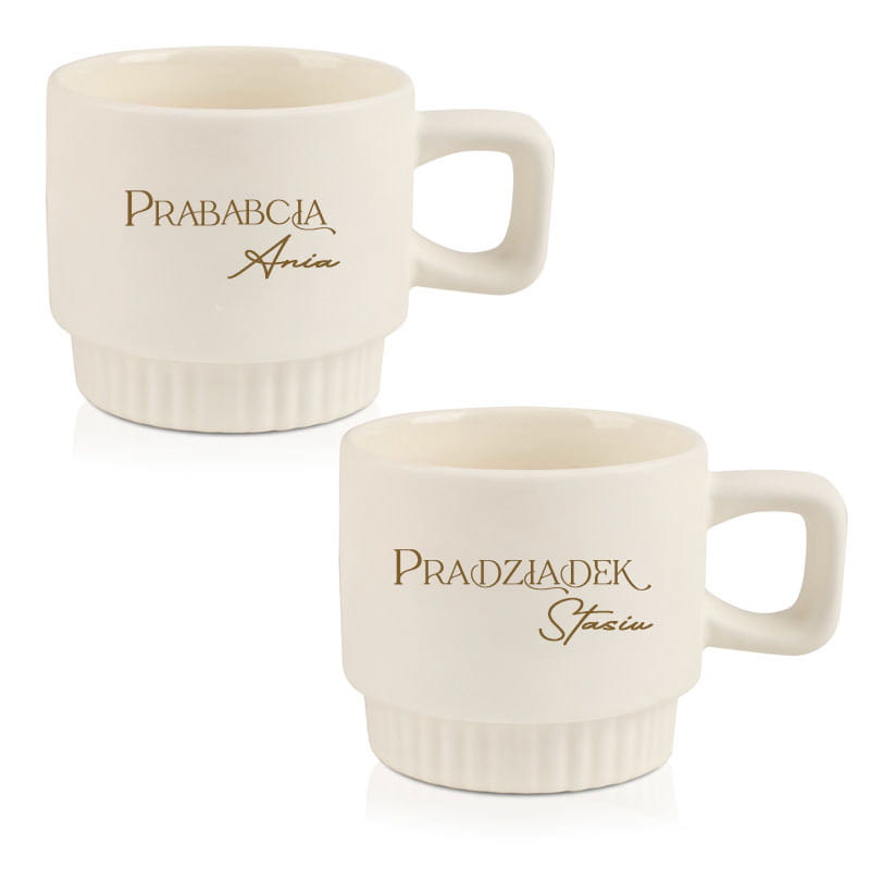 Personalizowany kubek dla prababci i pradziadka w nowoczesnym wydaniu. Filiżanka jest ryflowana, dostępna w trzech wariantach kolorystycznych. Możliwość zakupu jednego kubka lub zestawu dwóch z imionami. Idealny prezent rodzinny.
