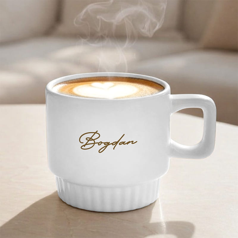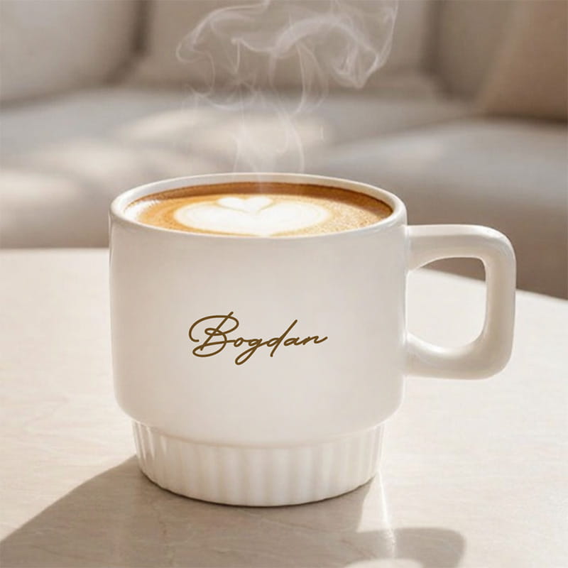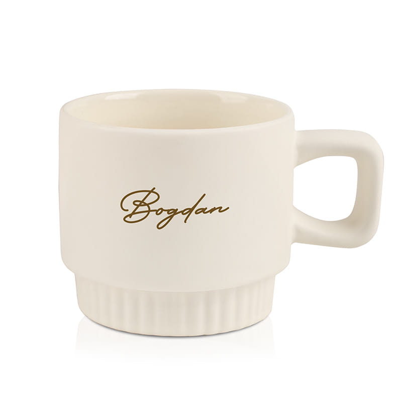 Kubek wykonany jest z ceramiki i wyróżnia się minimalistyczną formą oraz modnym ryflowaniem na spodzie, które nadaje mu designerskiego stylu. Do wyboru są trzy piękne kolory: różowy, kremowy i biały, dzięki czemu łatwo dopasować kubek do gustu obdarowanej osoby lub wystroju wnętrza. Na froncie umieszczane jest imię w ozdobnej czcionce, co dodaje całości elegancji i sprawia, że kubek wygląda naprawdę luksusowo. To świetny wybór zarówno do porannej kawy, jak i wieczornej herbaty, a przy tym prezentuje się wyjątkowo ładnie na stole czy półce.