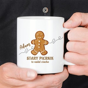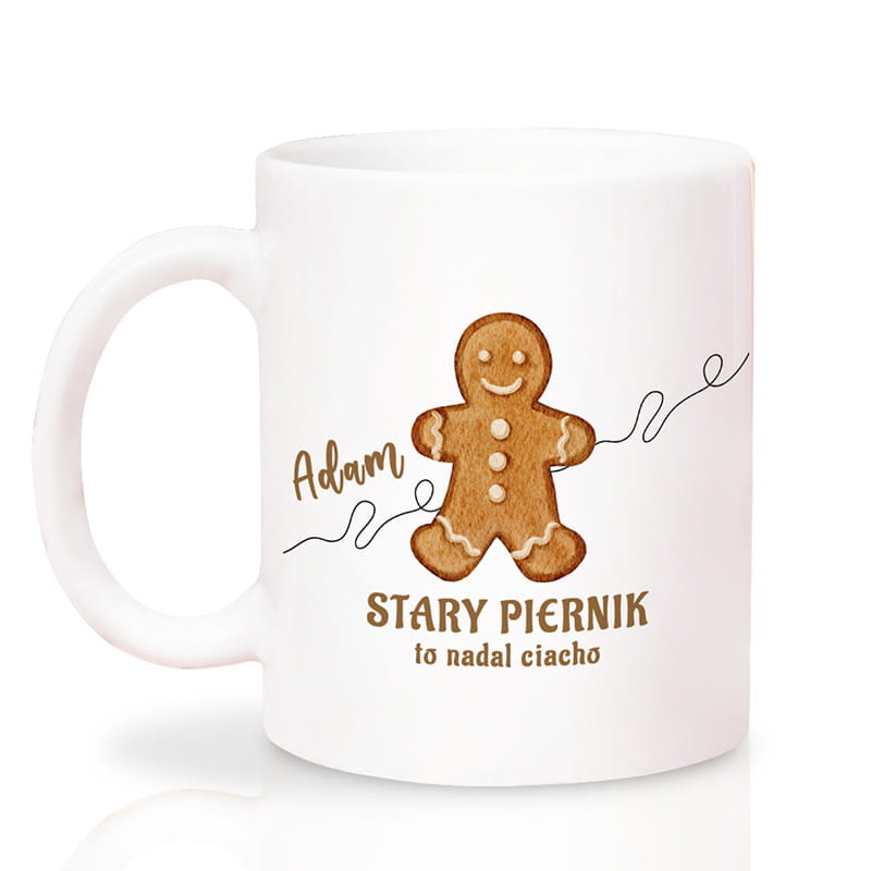Kubek wykonany jest z białej ceramiki z błyszczącym wykończeniem. Z przodu znajduje się kolorowa grafika przedstawiająca piernikowego ludzika oraz napis „Stary piernik to nadal ciacho". Nad grafiką umieszczone jest personalizowane imię, dzięki czemu każdy egzemplarz nabiera indywidualnego charakteru. Kubek ma klasyczny kształt, wygodne ucho i pojemność odpowiednią do porannej kawy, herbaty lub gorącej czekolady. Całość prezentuje się estetycznie i zachowuje trwałość nadruku nawet po wielu myciach.