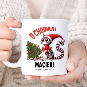 Kubek wykonany został z wysokiej jakości ceramiki, co gwarantuje trwałość nadruku oraz wygodę codziennego użytkowania. Na białej powierzchni kubka znajduje się kolorowy nadruk przedstawiający kota w czerwonej czapce świętego Mikołaja, siedzącego obok przewróconej choinki. Świąteczna ilustracja uzupełniona jest zabawnym napisem „O choinka!” i personalizacją, dzięki której produkt nabiera indywidualnego charakteru.