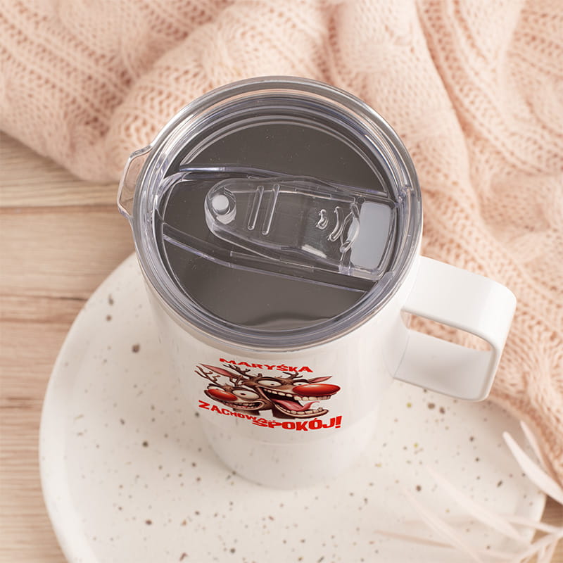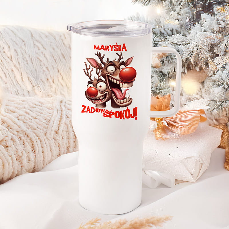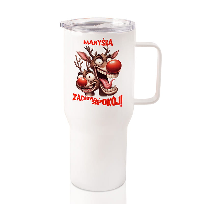 Kubek wykonany jest ze stali nierdzewnej, która utrzymuje temperaturę napojów. Wyposażony w ergonomiczny uchwyt oraz przezroczystą pokrywkę chroniącą przed rozlaniem, jest wygodny w codziennym użytkowaniu – w domu, w pracy, w podróży czy na świątecznych zakupach. Na białym kubku została umieszczona zabawna grafika z dwoma reniferami i imieniem osoby obdarowanej oraz napisem „Zachowaj spokój!”.