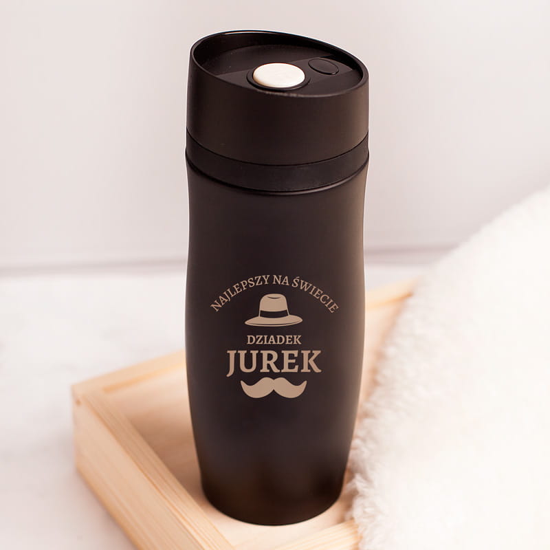 Stylowy kubek termiczny dla dziadka z wąsem i kapeluszem to świetny wybór na prezent na Dzień Dziadka. Czarna, matowa powierzchnia i jasny grawer z imieniem nadają mu elegancji i charakteru. Ten kubek z grawerem dla dziadka długo utrzymuje temperaturę napoju, a oryginalny motyw graficzny przyciąga uwagę. Praktyczny i wyjątkowy – na co dzień i na prezent.