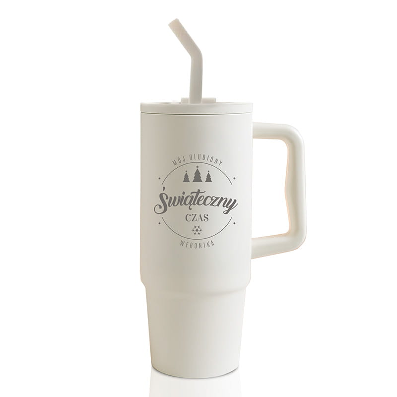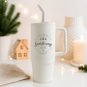Kubek jest w kolorze matowego kaszmiru. Wyraźny nadruk z choinkami i napisem nawiązującym do świąt został wykonany w delikatnej, szarej kolorystyce. Termos jest personalizowany imieniem. Wyposażony jest również w uchwyt oraz praktyczną pokrywkę z metalową słomką.