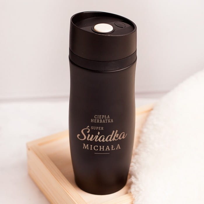 - Kubek termiczny w czarnym kolorze prezentuje się efektownie. Wykonany z wysokiej jakości materiału z pewnością jest praktycznym gadżetem. Termokubek posiada podwójną ściankę z próżnią, dzięki temu dłużej utrzymuje ciepło. Pokrywka jest plastikowa, wystarczy jeden klik, aby móc cieszyć się smacznym napojem. Na powierzchni kubka umieścimy ozdobny napis: Ciepła herbatka super świadka + imię. Personalizacja wykonana zostanie nowoczesną czcionką.