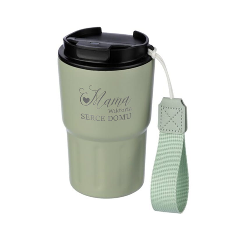 Kubek wyróżnia się nowoczesnym designem i subtelną, matową kolorystyką w odcieniu szałwii. Wyposażony jest w szczelną pokrywkę oraz wygodny pasek do przenoszenia, co zwiększa komfort użytkowania. Na jego powierzchni znajduje się elegancki napis dedykowany mamie oraz podpis – personalizacji podlega imię, co nadaje całości indywidualnego charakteru. Minimalistyczna forma i stonowane barwy sprawiają, że kubek prezentuje się wyjątkowo stylowo.