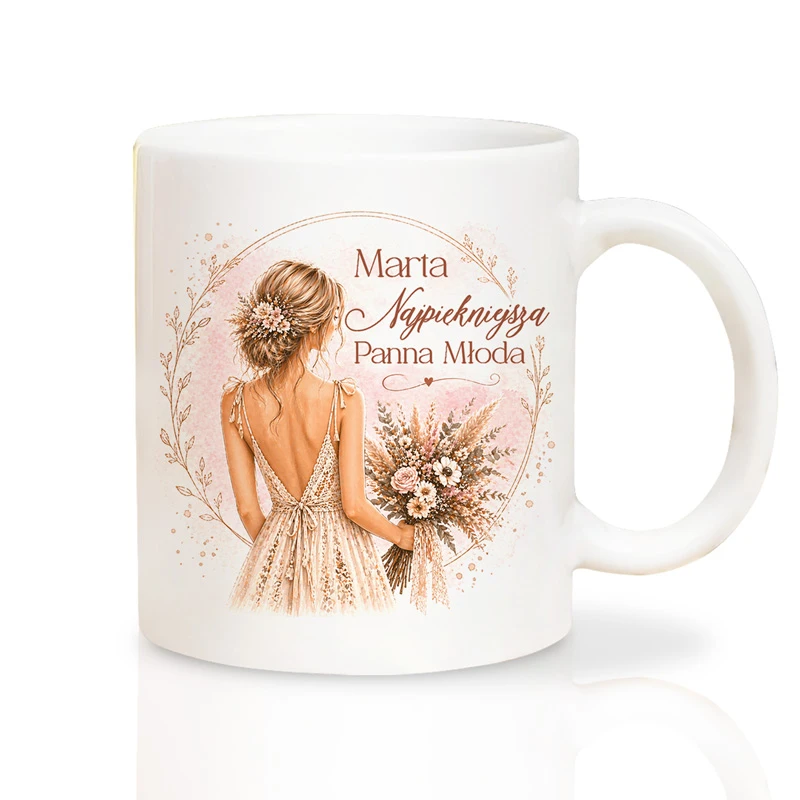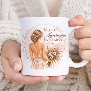 Kubek z imieniem zachwyca piękną grafiką przedstawiającą kobietę w ślubnej sukni z bukietem kwiatów. Obok ilustracji znajduje się imię oraz napis "Najpiękniejsza Panna Młoda". Kubek został wykonany z wysokiej jakości ceramiki. Jego klasyczny kształt oraz ergonomiczne ucho zapewniają komfort podczas picia ulubionej kawy lub herbaty.