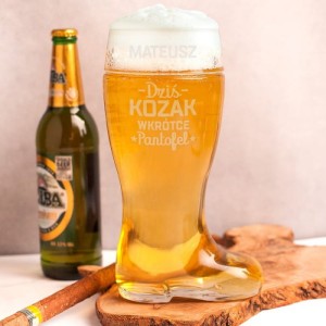 - Szklany kufel w kształcie buta, o sporej pojemności, aż 1 litra, czyli idealna objętość na imprezę z okazji imprezy kawalerskiej. Kufel do piwa wykonany jest z grubego szkła, na którym dodatkowo umieścimy specjalnie dla Pana Młodego pokrzepiającą dedykację.
