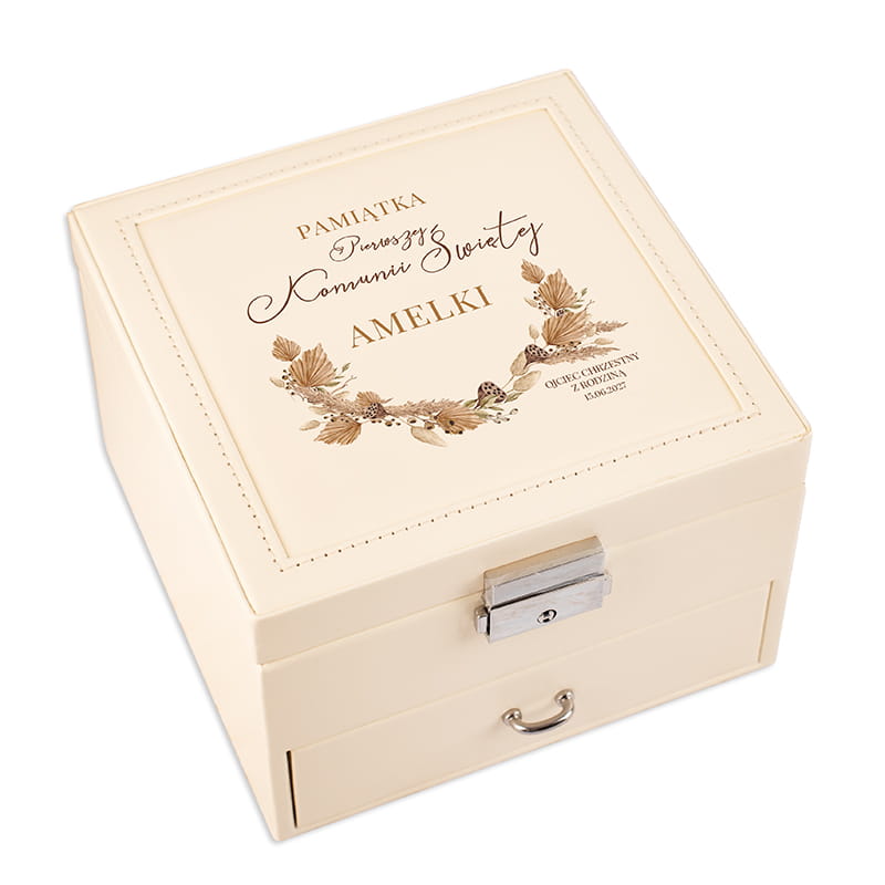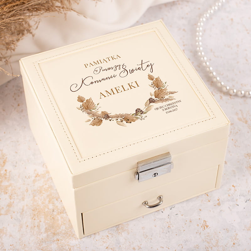 Personalizowany kuferek na biżuterię to elegancka pamiątka Pierwszej Komunii Świętej dla dziewczynki z imieniem i dedykacją. Wewnątrz znajduje się lusterko oraz wysuwana szufladka z przegródkami na biżuterię i drobne skarby. Zamknięcie na kluczyk sprawia, że szkatułka staje się wyjątkowym miejscem do przechowywania najcenniejszych pamiątek.