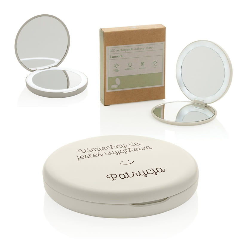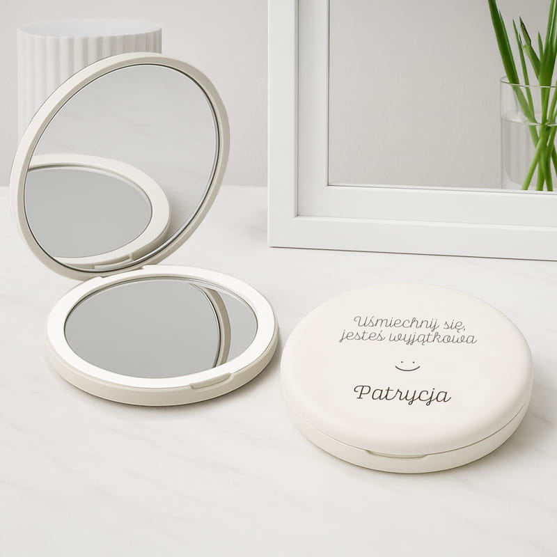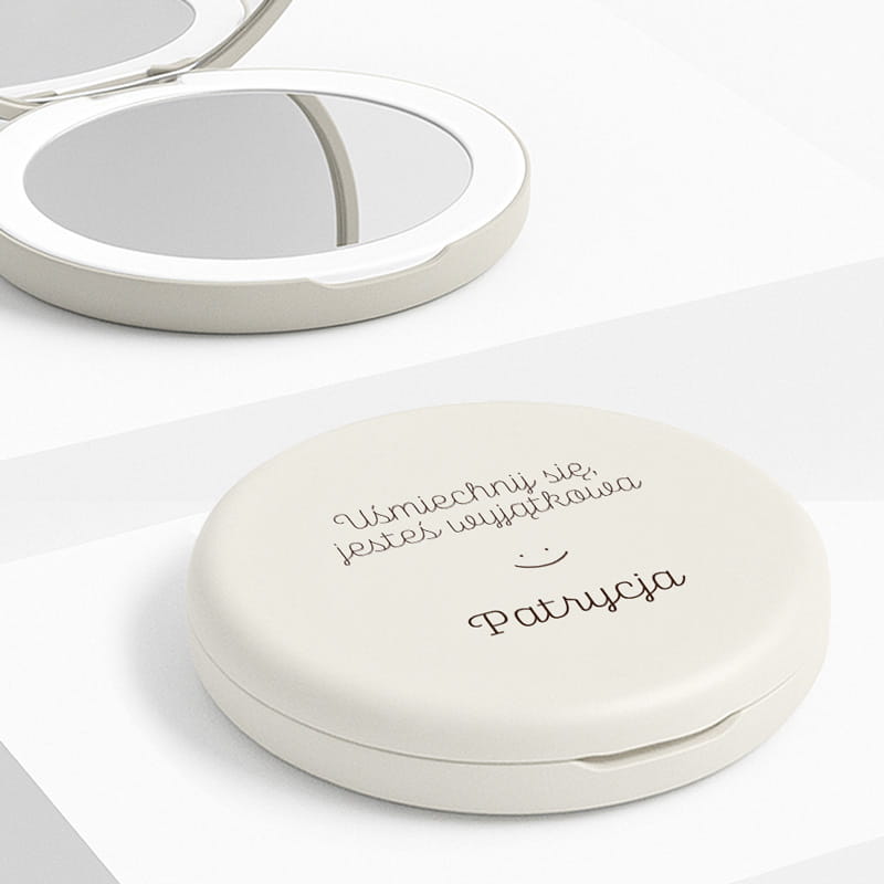 Lusterko wykonane jest z trwałego tworzywa w odcieniu kości słoniowej, zamykane na praktyczny zatrzask. Wewnątrz znajdują się dwa zwierciadła – jedno standardowe i drugie powiększające, co ułatwia dokładne poprawki makijażu. Subtelne, równomierne podświetlenie LED pozwala korzystać z lusterka nawet przy słabym świetle. Na zewnątrz lusterka widnieje napis i imię.
