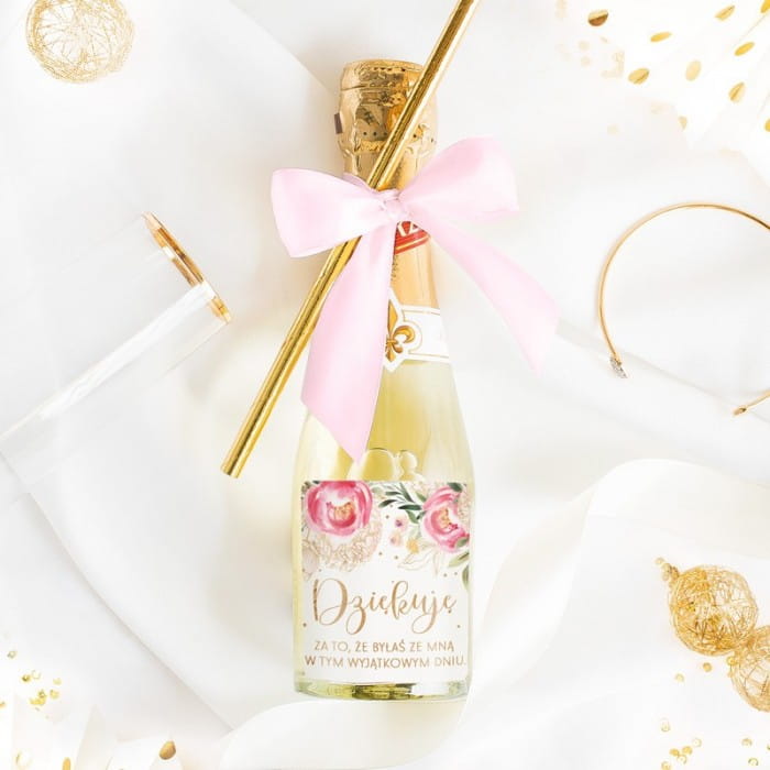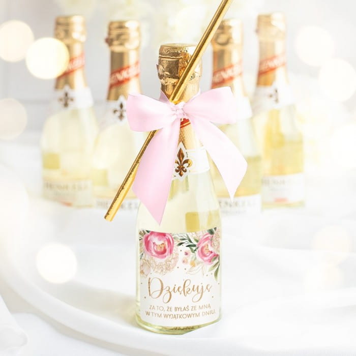 Bezalkoholowy szampanik idealnie sprawdzi się jako podziękowanie dla dziewczyn, przyjaciółek. Pozwoli podziękować bliskim osobom za obecność podczas wieczoru panieńskiego. Mini wino jest musujące i z pewnością przypadnie do gustu obdarowanych kobiet. W zestawie znajduje się dekoracyjna etykieta, która zawiera piękną kwiatową grafikę. Ozdobną czcionką wykonamy napis: Dziękuję za to, że byłaś ze mną w tym wyjątkowym dniu. Do kompletu dołączymy piękną wstążkę do samodzielnego umieszczenia na butelce. Natomiast słomkę należy zakupić osobno, dostępna jest również w naszym sklepie.