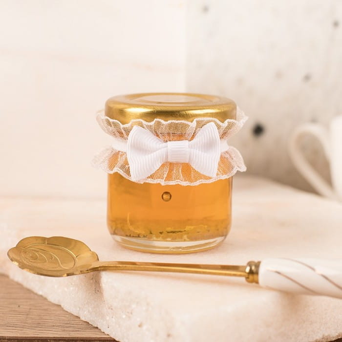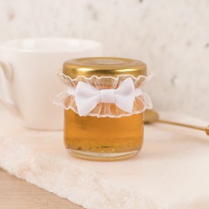Mini słoiczek z miodem został ozdobiony uroczą falbanką i kokardką w kolorze białym. Dekoracja jest osadzona na gumce, która utrzymuje ją w odpowiednim miejscu. Jednocześnie nadaje całości nieco dziewczęcego, romantycznego wyglądu. Miód pochodzi z polskiej pasieki, jest całkowicie naturalny i stanowi źródło cennych składników korzystnych dla zdrowia. Transparentne ścianki słoiczka pięknie eksponują jego kolor. Słoiki mają nakrętki w kolorze czarnym lub złotym, wysyłanym losowo.