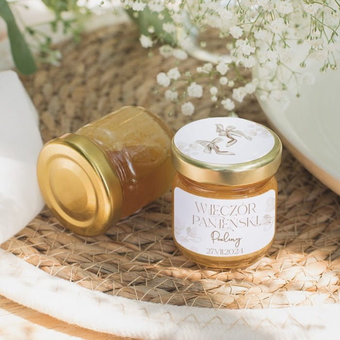 - Naturalny miód wielokwiatowy z polskiej pasieki, zamknięty w uroczym słoiczku, stanowi wyjątkowy i ciekawy pomysł na upominek dla gości na wieczór panieński. Słoiczek zdobią dwie naklejki. Okrągła jest na zakrętce, przedstawiającą przepiękne buty ślubne, które stanowią część motywu przewodniego kolekcji Wieczór Panieński. Prostokątna etykieta na przedzie słoiczka. Na niej znajduje się personalizacja. Miód to nie tylko smakowity dodatek do potraw, ale także cenny element diety! Przede wszystkim, jest to naturalny produkt pochodzący z lokalnych pasiek, co wpływa na wysoką jakość oraz świeży smak. Wielokwiatowy charakter miodu oznacza, że pochodzi z nektaru różnorodnych kwiatów, co przekłada się na bogaty, złożony smak i zapach produktu. Miód ten jest również ceniony ze względu na swoje prozdrowotne właściwości, zawiera wiele cennych składników odżywczych, enzymów i przeciwutleniaczy. Słoiczek ozdobiony personalizowanymi etykietami dodatkowo pięknie się prezentuje!