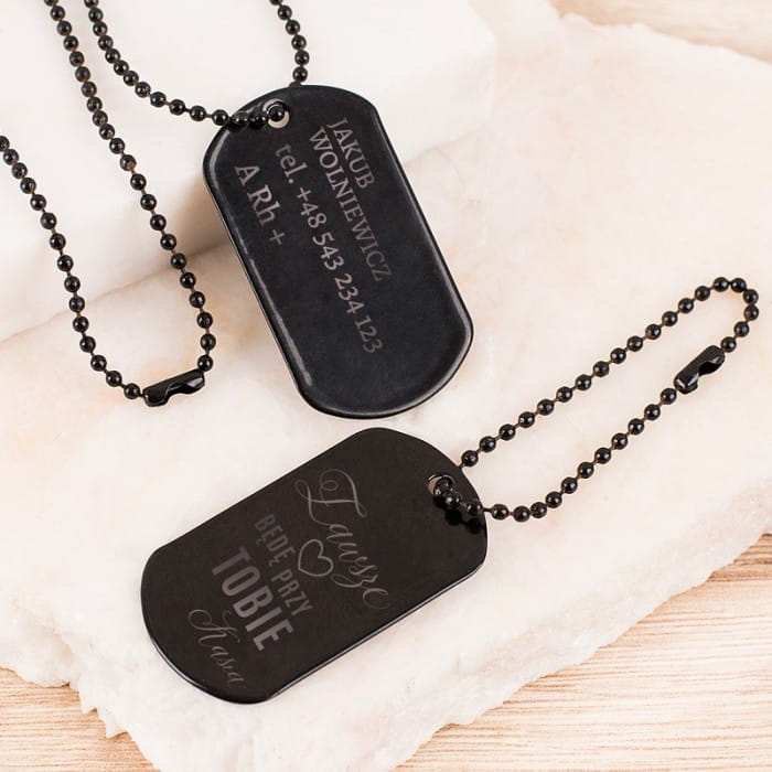 Święto zakochanych zbliża się wielkimi krokami. Zastanawiasz się, jaki prezent na Walentynki wybrać dla ukochanego? Czarny nieśmiertelnik z grawerem to oryginalny pomysł na praktyczny podarunek walentynkowy dla każdego mężczyzny. Zestaw składa się z dwóch blaszek zawieszonych na osobnych łańcuszkach — długim i krótkim. Na blaszce z naszyjnikiem umieszczone są informacje takie jak imię i nazwisko, numer telefonu i grupa krwi. Na drugiej zawieszce wygrawerowany jest ozdobny napis: Zawsze będę przy Tobie TWOJE IMIĘ. Zastosowanie kulkowego łańcuszka umożliwia regulację długości.