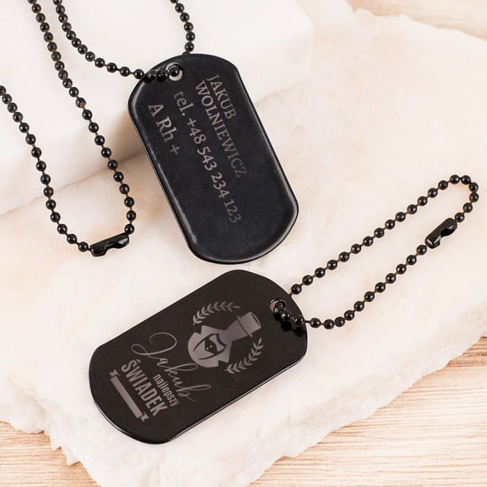 Metalowy nieśmiertelnik w czarnym kolorze na łańcuszku kulowym będzie świetną pamiątką z Twojego ślubu. Na jego powierzchni umieścimy personalizację w postaci danych świadka. Uzupełnieniem do wisiorka będzie blaszka nieśmiertelnika na krótszym łańcuszku, co sprawia, że ten element może być zawieszką do zamka w plecaku lub brelok. Na blaszce z krótszym łańcuszkiem z kolei znajdzie się okazjonalna dedykacja w formie graweru z napisem: Najlepszy świadek na świecie. Nieśmiertelnik dostępny na naszej stronie internetowej wykonany jest z wysokiej jakości metalu. Dzięki temu jest wytrzymały i odporny na uszkodzenia mechaniczne oraz kontakt z wodą. Całość utrzymana jest w czarnej tonacji. Do gadżetu dołączony jest łańcuszek, co pozwoli świadkowi na przymocowanie prezentu jako zawieszki lub breloczka. Istotnym elementem jest możliwość pełnej personalizacji. Na froncie umieszczony jest wizerunek mężczyzny w cylindrze, napis „Najlepszy świadek” oraz imię obdarowanego. Na rewersie możesz umieścić imię i nazwisko świadka, numer telefonu oraz grupę krwi. Blaszany nieśmiertelnik z zawieszką to ciekawa propozycja, która warto wykorzystać.