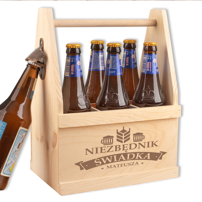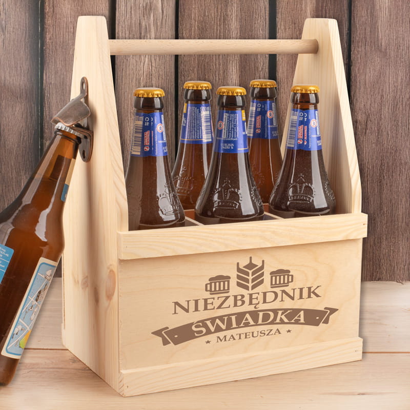 Prezenty dla świadka to już tradycja. Nosidło na 6 piw z otwieraczem dla świadka wykonane jest z jasnego gatunku drewna. Widoczny jest na nim rysunek sęków, co sprawia, że każdy egzemplarz jest wyjątkowy. Na krótszych bokach skrzynka od połowy jest ociosana, co tworzy kształt podobny do szyjki. U góry są wycięte dwa otwory, a przez nie przewleczony gruby sznur, tworzący uchwyt. Na dłuższych bokach nie ma pełnych ścianek, a jedynie mniejsze drewienka. To jednak nie wpływa na stabilność butelek włożonych do środka. Na jednym z drewienek wykonamy personalizowany nadruk. Znajdzie się na nim napis: „Niezbędnik świadka”, a także personalizacja w postaci imienia świadka. To ostatnie jest wpisane we wstęgę, co podkreśla wyjątkowy wkład świadka w uroczystość i przyjęcie. Ponadto znajdują się tam również grafiki. Dwa kufle piwa umieszczone są symetrycznie po dwóch stronach, a między nimi znajduje się kłos chmielu. Z boku zawieszony jest otwieracz z napisem „open here”.