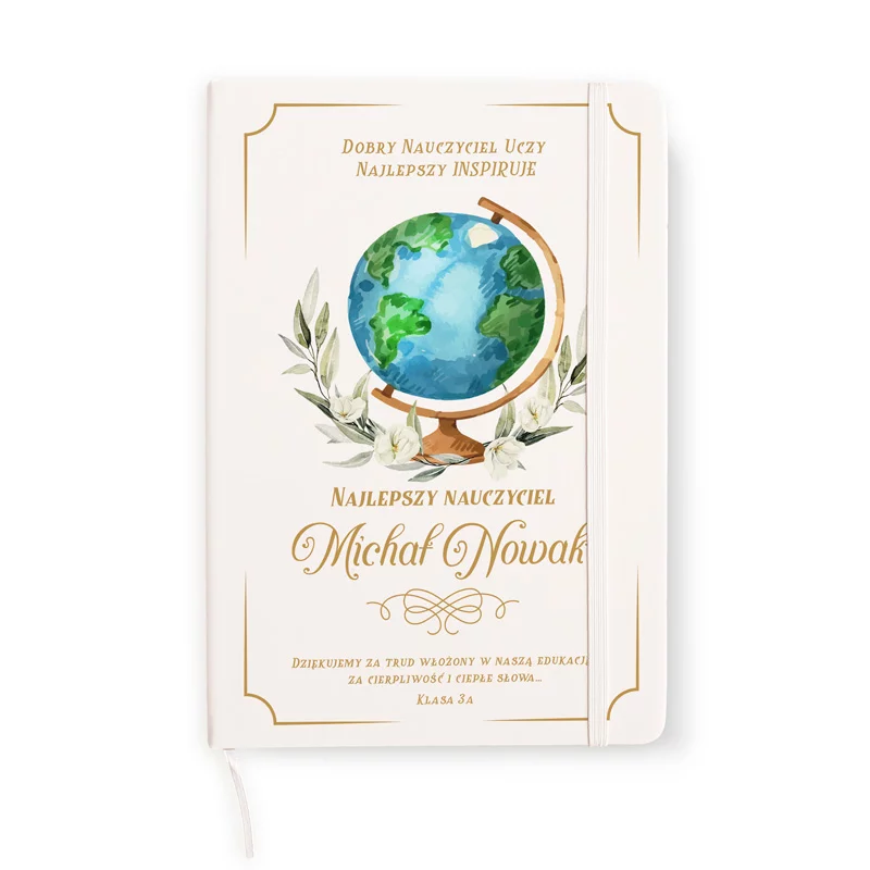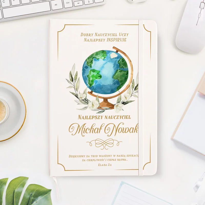 Personalizowany notatnik z nazwiskiem i imieniem nauczyciela to prezent pełen emocji i wdzięczności, który z pewnością zostanie doceniony przez każdego pedagoga. Motywujący cytat na okładce stanowi piękne przesłanie od uczniów, dodając całości wyjątkowego charakteru. Jego uniwersalny design sprawia, że sprawdzi się zarówno jako upominek dla nauczyciela, jak i nauczycielki. Na okładce znajduje się piękna ilustracja globusa w otoczeniu kwiatów, a poniżej elegancki napis: "Najlepszy nauczyciel - imię i nazwisko".