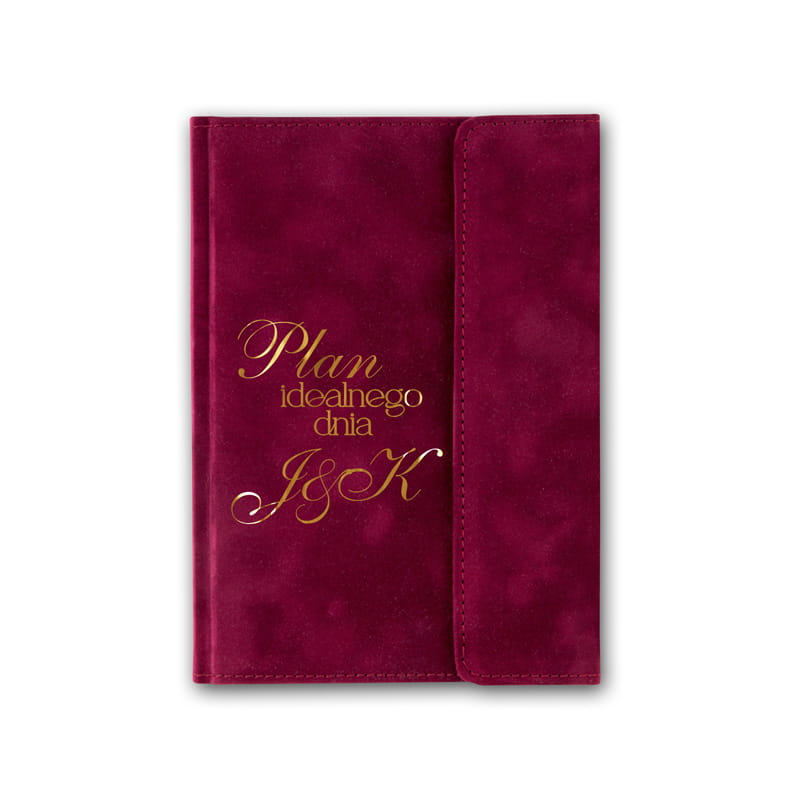 Notes wykonany jest z wysokiej jakości materiału – jego miękka, przyjemna w dotyku welurowa okładka w odcieniu głębokiego bordo prezentuje się niezwykle elegancko. Na froncie znajduje się tłoczony, złoty napis: „Plan idealnego dnia” oraz personalizowane inicjały przyszłych małżonków. Zamykanie na zakładkę z magnesem sprawia, że zawartość pozostaje bezpieczna. Wewnątrz znajduje się 96 kartek do samodzielnego zapisywania – bez nadrukowanych treści, dzięki czemu notes ślubny można dowolnie dostosować do indywidualnych potrzeb. Starannie wykończony i solidnie zszyty, stanowi elegancki dodatek do organizacyjnych narzędzi panny młodej i pana młodego.