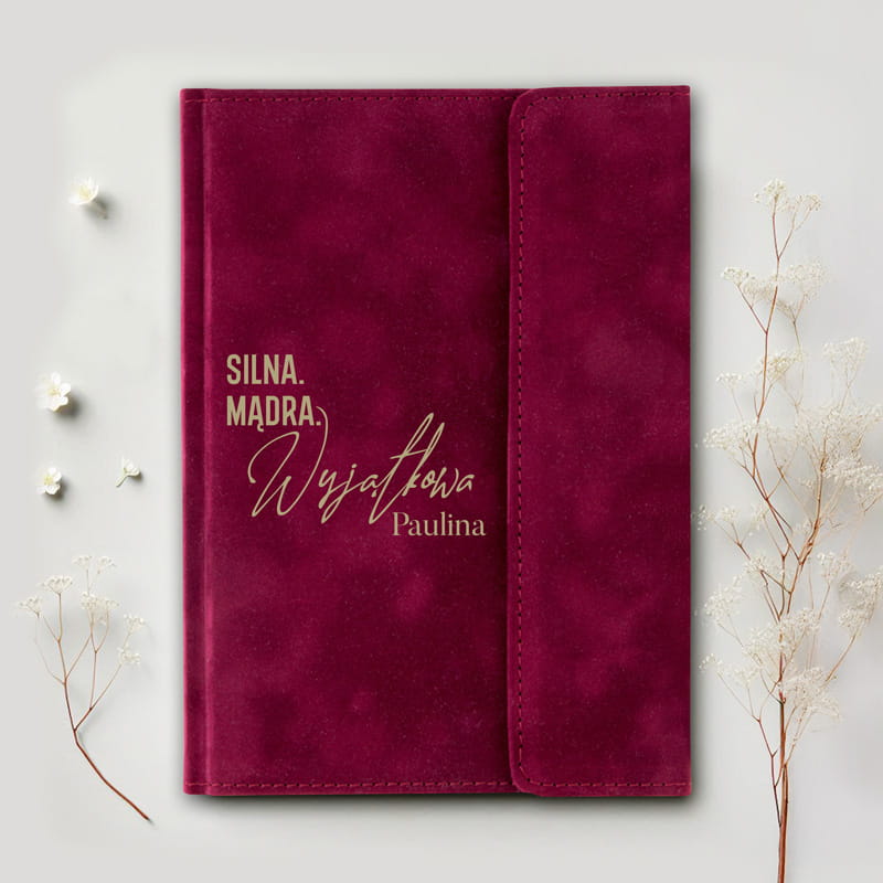 Welurowy notes z personalizacją to elegancki prezent dla kobiety, który zachwyca wyglądem oraz praktycznym zastosowaniem. Okładka została wykonana z weluru, dlatego notes prezentuje się elegancko. Na froncie znajduje się napis „Silna. Mądra. Wyjątkowa.” oraz imię obdarowanej osoby. Notes posiada praktyczne zapięcie na magnes, które chroni przed przypadkowym otwarciem. W środku znajdują się kartki w kratkę, które ułatwiają prowadzenie notatek, planów czy zapisywanie ważnych myśli. Dodatkowo miejsce na długopis zwiększa funkcjonalność notatnika.