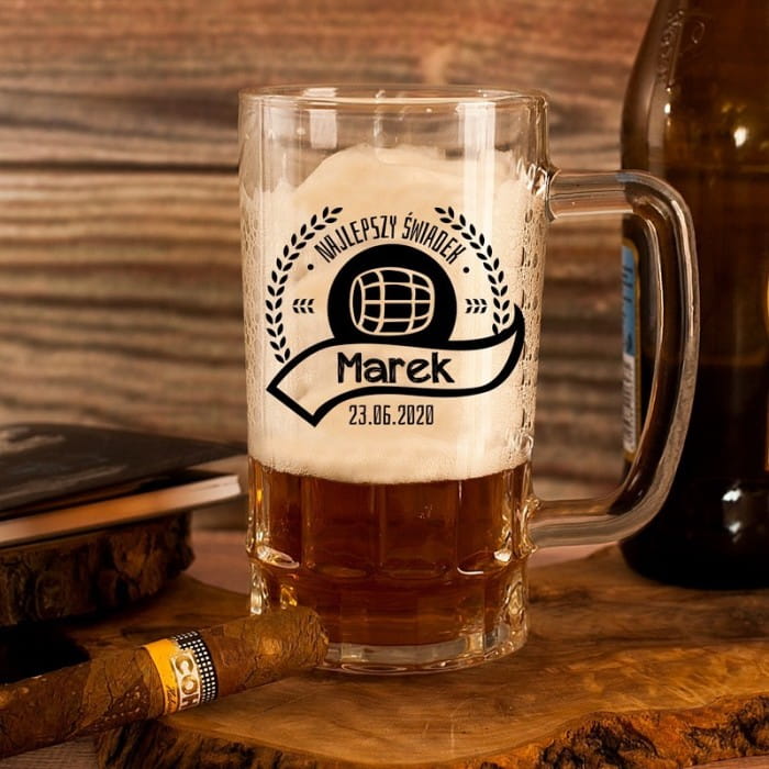 - Ponadto męska, ale pamiątkowa grafika z napisem NAJLEPSZY ŚWIADEK to akcent, który nada kuflowi charakteru pamiątki. Świadek z dumą będzie pił piwko z tego kufla, jednocześnie pamiętając, w jakiej sytuacji stał się jego właścicielem.