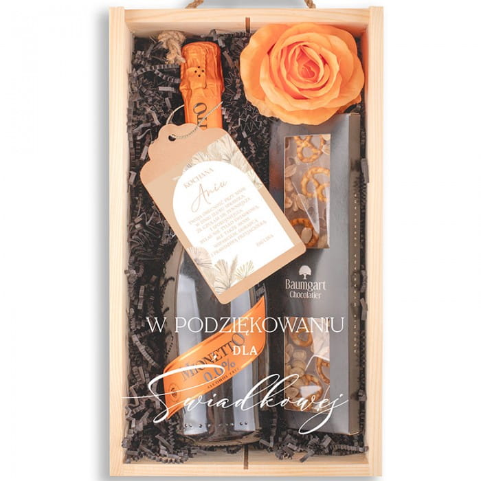 Zestaw jest idealny na każdą okazję, gdzie chcesz wyrazić swoją wdzięczność i docenić świadkową. To doskonały prezent na podziękowanie dla świadkowej, który może być wręczony zarówno przed ślubem, jak i po ceremonii. Dzięki personalizacji każdy element zestawu nabiera indywidualnego charakteru, co sprawia, że obdarowana osoba poczuje się naprawdę wyjątkowo. Zestaw prezentowy to elegancki i przemyślany sposób na wyrażenie wdzięczności. Bezalkoholowy szampan, wykwintna czekolada i personalizowana zawieszka tworzą idealną kompozycję, która z pewnością zostanie doceniona. Wybierając ten zestaw, pokazujesz, jak bardzo cenisz sobie obecność i wsparcie swojej świadkowej. To prezent, który zostanie zapamiętany na długo.