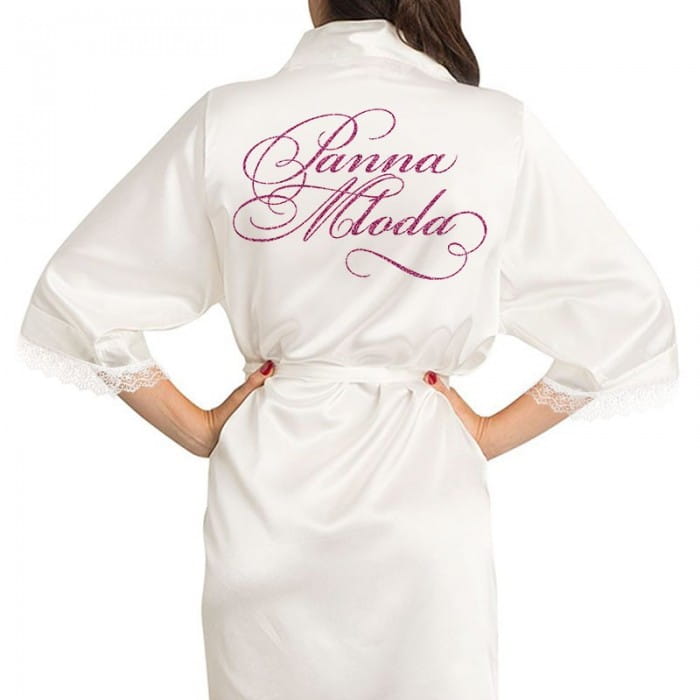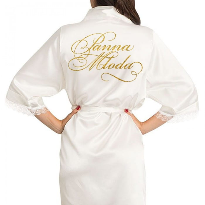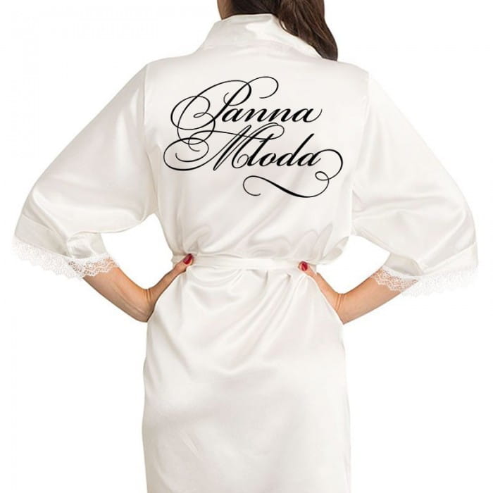 Elegancki, miękki szlafrok satynowy w kolorze ecrue, jego rękawki obszyte są delikatną koronką. Na plecach ma napis "Panna Młoda" w kolorze czarnym, złotym lub ciemnoróżowym, który wykonany jest ozdobną czcionką. Napisy w kolorze złotym i ciemnoróżowym są cieniowane i sprawiają wrażenie brokatowych. Szlafrok zapakowany jest w eleganckie pudełko, gotowe do wręczenia na prezent!