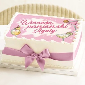 - Na białej chmurce widnieje napis „Wieczór panieński”. Po tych słowach na opłatku znajdzie się odmienione imię przyszłej panny młodej. Opłatek na wieczór panieński jest jadalny, zatem możecie go zjeść razem z tortem kawałek po kawałku. Oczywiście dobrze sprawdzi się na torcie z kremem. Można jednak nim ozdobić również sernik wykonany w prostokątnej formie.