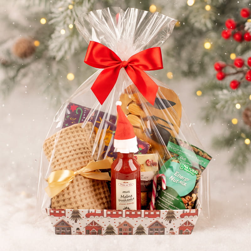 Kompletny świąteczny zestaw prezentowy, który łączy naturalne produkty z praktycznymi dodatkami. W środku znajduje się miękki ręcznik o waflowej strukturze, deska do serów, aromatyczne herbaty, mus malinowo-truskawkowy z czapeczką, orzechy, czekolada rzemieślnicza, laska cukrowa i świąteczne pudełko. To idealny gotowy prezent na Boże Narodzenie dla bliskiej osoby.