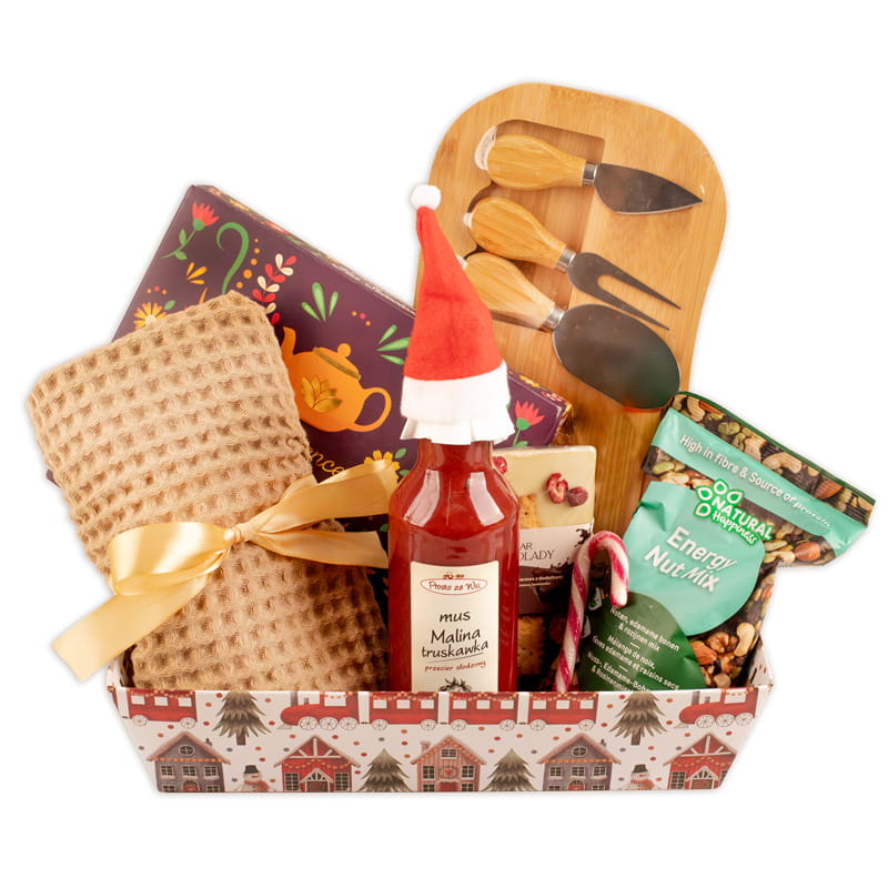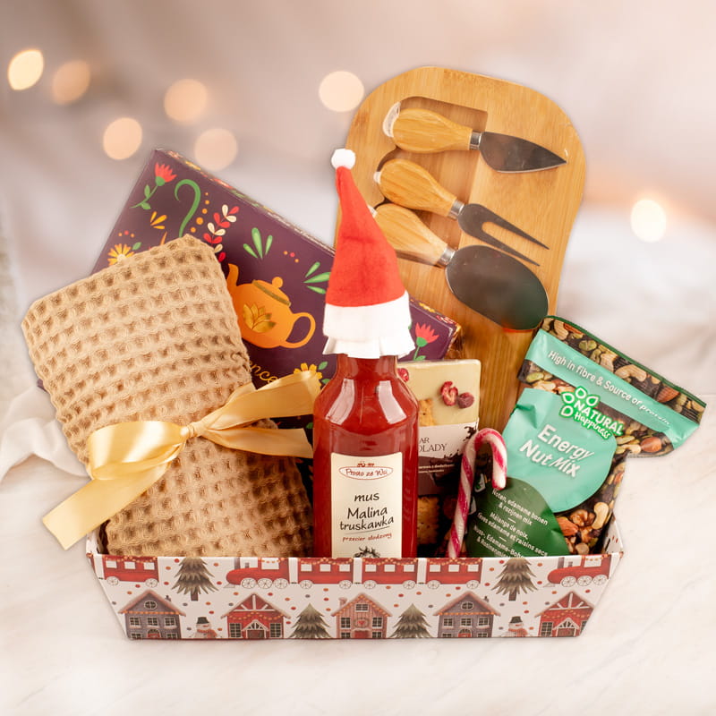 Całość została umieszczona w kartonowym pudełku z losowym wzorem w świątecznym stylu. Wewnątrz znajduje się miękki ręcznik o waflowej strukturze, zawiązany złotą wstążką. Głównym akcentem praktycznym jest deska do serów z trzema przyrządami, idealna do serwowania przekąsek. Do tego dołączono wysokiej jakości herbaty, mus malinowo-truskawkowy w szklanej butelce z czapeczką Mikołaja, czekoladę z suszonymi owocami, mieszankę orzechów oraz klasyczną laskę cukrową. Kompozycja została starannie ułożona i zabezpieczona celofanem z efektowną, czerwoną kokardą.