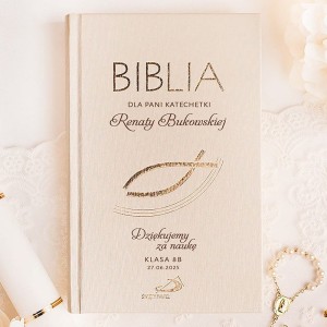 Podziękuj katechetce za duchowe wsparcie i wartościowe lekcje religii w sposób wyjątkowy – wręczając jej elegancką, personalizowaną Biblię. Ta wyjątkowa edycja została zaprojektowana z myślą o nauczycielach religii, którzy przez lata kształtowali postawy moralne i duchowe uczniów. Okładka w delikatnym, kremowym odcieniu została ozdobiona złoconym napisem oraz symbolicznym motywem ryby, który podkreśla chrześcijański charakter prezentu. Imię katechetki, klasa oraz data umieścimy bezpośrednio na okładce, dzięki czemu upominek nabiera osobistego i wzruszającego wymiaru.