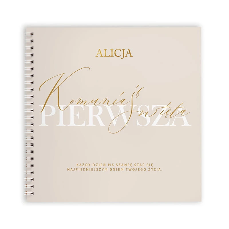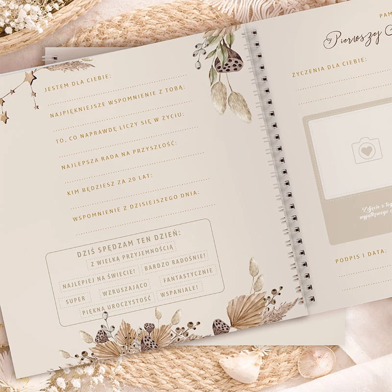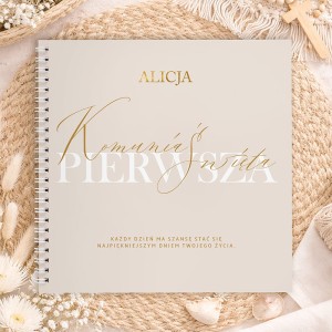 Księga wykonana jest w stylu boho, z delikatnymi, roślinnymi motywami i subtelną kolorystyką beżu. Na okładce znajduje się personalizacja - imię dziecka oraz napis „Pierwsza Komunia Święta”. W środku znajduje się aż 25 ankiet, które goście mogą wypełniać samodzielnie lub wspólnie. Każda strona zawiera miejsce na życzenia, wspomnienia, rady na przyszłość, a także przestrzeń na zdjęcie i podpis. Dodatkowym elementem jest kreatywna część, jak labirynt nawiązujący do drogi wiary.