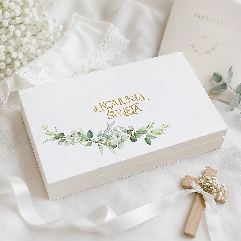 Pudełko zostało wykonane z naturalnego drewna, dzięki czemu prezentuje się solidnie i stylowo. Jego wnętrze skrywa miejsce na banknoty. W środku umieścimy spersonalizowaną dedykację zawierającą imię dziecka, datę uroczystości i podpis, co nadaje całości indywidualnego charakteru. Delikatne motywy roślinne oraz jasna kolorystyka idealnie wpisują się w klimat Pierwszej Komunii Świętej.