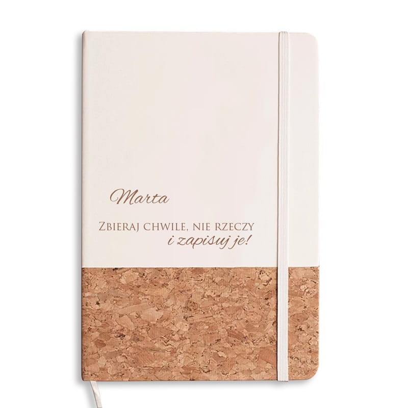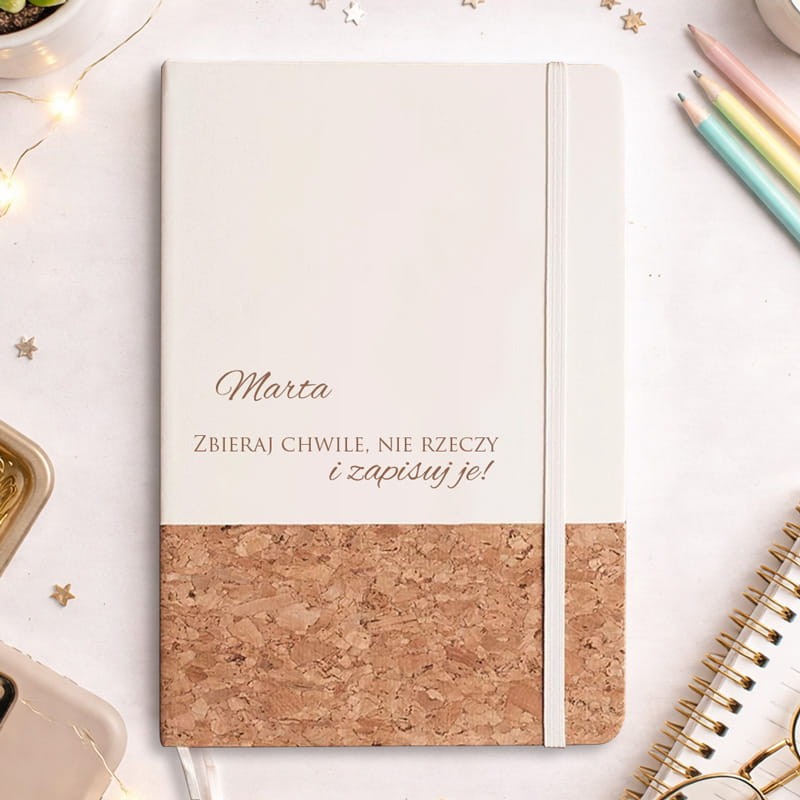 Notatnik wyróżnia się nowoczesnym, minimalistycznym designem w naturalnej kolorystyce. Górna część okładki utrzymana jest w jasnym, kremowym odcieniu, natomiast dolna wykonana została w stylu korka, co nadaje całości oryginalnego i modnego charakteru. Na froncie znajduje się imię oraz inspirujący napis „Zbieraj chwile, nie rzeczy i zapisuj je!”, wykonane elegancką czcionką. Dodatkowym atutem jest elastyczna gumka zabezpieczająca oraz wstążka do zaznaczania stron. Personalizacji podlega imię umieszczone na okładce.