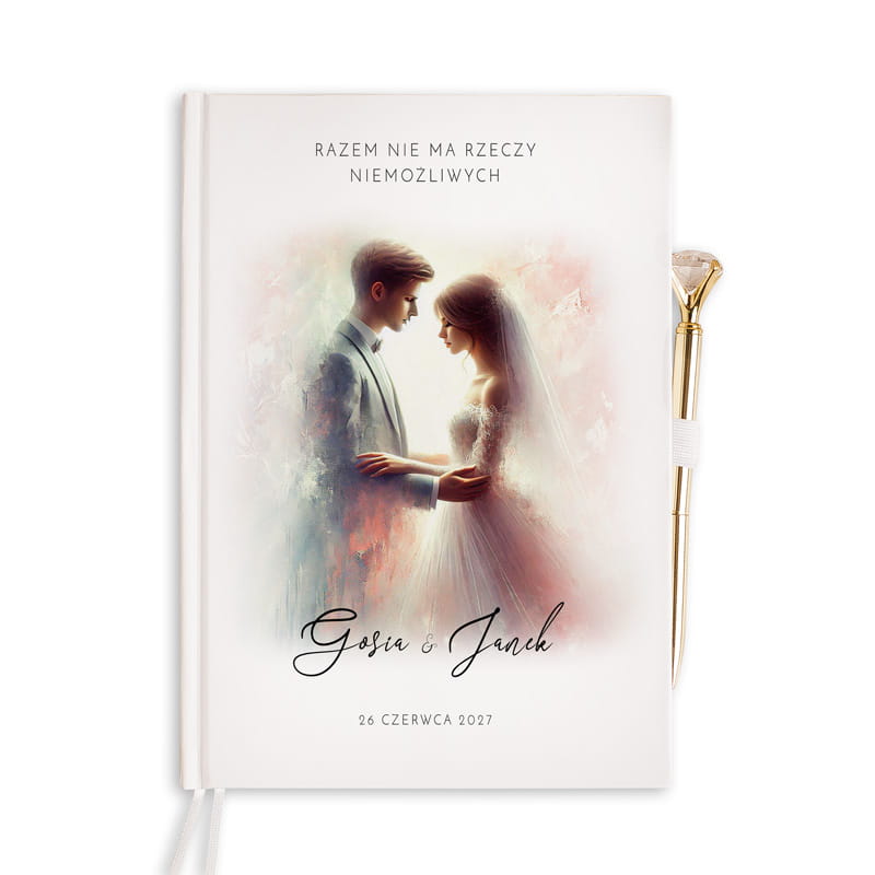 Planer zaprojektowany został z myślą o parach, które pragną mieć wszystkie szczegóły ślubne w jednym miejscu. Jego twarda oprawa chroni wnętrze przed uszkodzeniami, a gładkie, wysokiej jakości kartki ułatwiają notowanie. Okładka ozdobiona jest delikatną ilustracją pary młodej, otuloną pastelowymi barwami, które dodają całości subtelności. Na górze znajduje się wzruszający cytat: „Razem nie ma rzeczy niemożliwych”, a niżej imiona przyszłych małżonków oraz data ślubu, które nadają planerowi osobistego charakteru. Wewnątrz znajduje się wielostronicowy układ, podzielony na sekcje ułatwiające planowanie każdego aspektu ceremonii. Możesz znaleźć miejsce na listę gości, harmonogram przygotowań, budżet oraz inspiracje dotyczące dekoracji czy menu. Dodatkowo planer posiada zakładkę w postaci tasiemki, dzięki której łatwo wrócisz do ważnych notatek. Do zestawu dołączony jest również złoty długopis z dekoracyjnym kryształkiem, który doskonale komponuje się z całością.