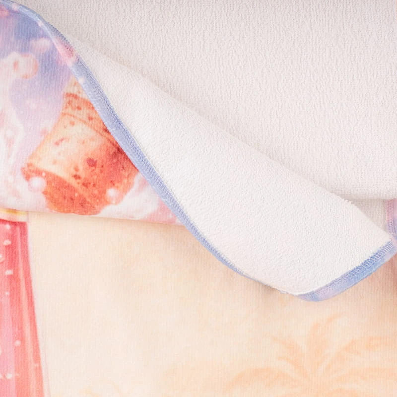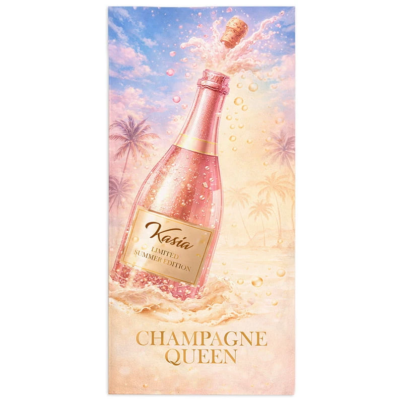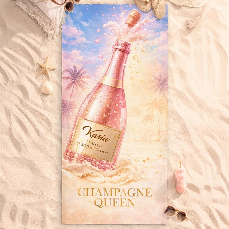 Ręcznik wyróżnia się efektowną grafiką w letnim, kobiecym stylu - z motywem różowego szampana, palm i napisem „Champagne Queen”, który podkreśla radosny, imprezowy klimat. Możliwość dodania imienia sprawia, że ręcznik staje się jeszcze bardziej wyjątkowy. To idealny gadżet dla przyszłej panny młodej na wieczór panieński -świetnie sprawdzi się jako element stylizacji, rekwizyt do zdjęć czy praktyczny dodatek podczas wyjazdu.