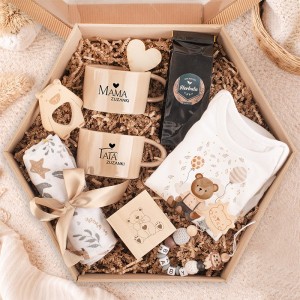Zestaw na narodziny dziecka dla mamy i taty - personalizowany box z kubkami, body i dodatkami. Idealny prezent dla rodziców.