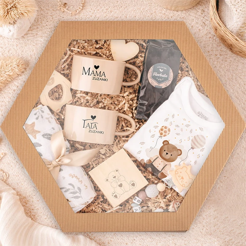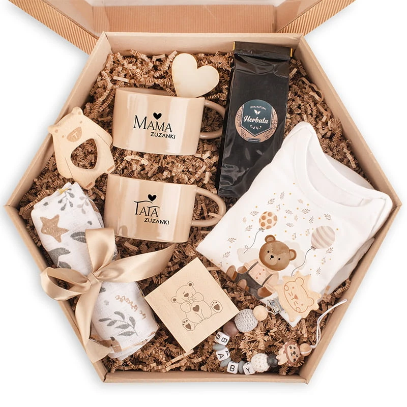 W zestawie znajdują się starannie dobrane elementy dla całej rodziny. Dwa ceramiczne kubki w beżowym kolorze dla mamy i taty z personalizacją imienia dziecka, pielucha tetrowa, body dla dziecka z motywem misia, a także drewniana kostka, zawieszka do smoczka oraz gryzak. Całość uzupełnia dekoracyjna tabliczka w kształcie serca oraz aromatyczna herbata dla rodziców. Wszystko zapakowane jest w eleganckie pudełko z okienkiem w kształcie heksagonu, które nadaje prezentowi wyjątkowego charakteru.