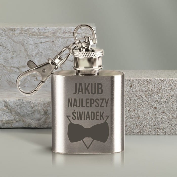 - Piersiówka z haczykiem do kluczy podziękowanie dla świadka to zupełnie wyjątkowy gadżet. Wpisuje się w klasyczną stylistykę. Ma kwadratowy, a jednocześnie wyoblony na brzegach kształt. Dzięki temu nie jest widoczna, gdy włoży ją do wewnętrznej kieszeni marynarki. Duża srebrna zawleczka chroni przed wylaniem alkoholu, a także jego wietrzeniem. Haczyk do kluczy sprawia, że piersiówka staje się oryginalnym brelokiem. Na powierzchni piersiówki widoczna jest personalizacja. Nadrukujemy metodą laserową słowa: „Najlepszy świadek”. Będzie je poprzedzać imię Twojego świadka. Poniżej znajdzie się trójkątny kształt i wpisana w niego muszka, czyli symbol koszuli i eleganckiego dodatku. Będzie doskonałym atrybutem gentlemana, który sprawdzi się w kryzysowych, stresowych sytuacjach.
