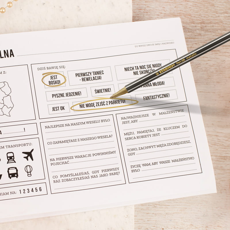 Metaliczny pisak to elegancki dodatek, który pozwala gościom pozostawić trwałe i efektowne wpisy w księdze pamiątkowej. Jego metaliczny tusz nadaje każdej dedykacji wyjątkowego charakteru, sprawiając, że wspomnienia stają się jeszcze bardziej wyraziste. Dzięki niemu każdy wpis przyciąga wzrok i dodaje uroczystości niepowtarzalnego blasku.