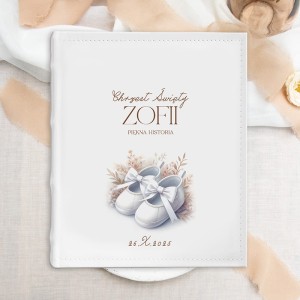 Personalizacja albumu obejmuje imię maluszka oraz datę uroczystości, dzięki czemu nabiera on wyjątkowego i indywidualnego charakteru. Na okładce znajdują się urocze, małe dziecięce buciki, a całość utrzymana jest w jasnej, delikatnej kolorystyce. Ten subtelny motyw podkreśla wyjątkowość i ciepło chwili, którą ma upamiętniać album. Został on stworzony z myślą o przechowywaniu najważniejszych wspomnień z Chrztu Świętego. Idealnie sprawdzi się jako miejsce na zdjęcia z ceremonii, rodzinnych spotkań oraz wzruszających momentów. Wnętrze albumu zawiera strony przeznaczone do samodzielnego wklejania fotografii, co daje pełną swobodę w ich układaniu. Każde zdjęcie tworzy część osobistej historii o duchowym początku dziecka. Wewnątrz albumu znajduje się delikatne przedzielenie stron bibułkami, które mają na celu chronić fotografie przed uszkodzeniem.